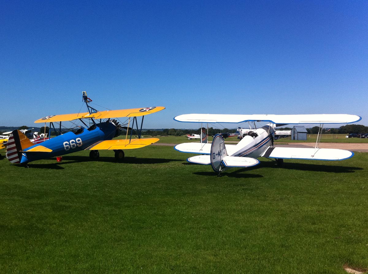 A lovely Boeing Stearman complete with wingwalking gear parked next another of the four Stampes, G-AYIJ.