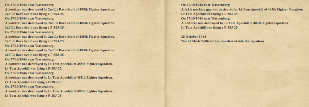 2nd Lt. Sidney Gittens of the 485th had a close call with the flak and took damage and Maj. Payne-Less endulged his horticultural persuasions by collecting a tree during one of his strafing runs; but we are glad to say that they each made it back to force land at friendly airfields near the front.