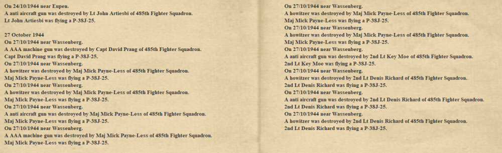 After a quiet air patrol the 485th again found targets to attack around the front lines ahead of the push by our ground forces in the Wassenberg area. Setting to with their usual fervor, the 485th accounted for 23 AAA and artillery pieces and once again earned the appreciation of our soldiers. Another excellent performance 485th and just what we've come to expect from you hard charging bastards.