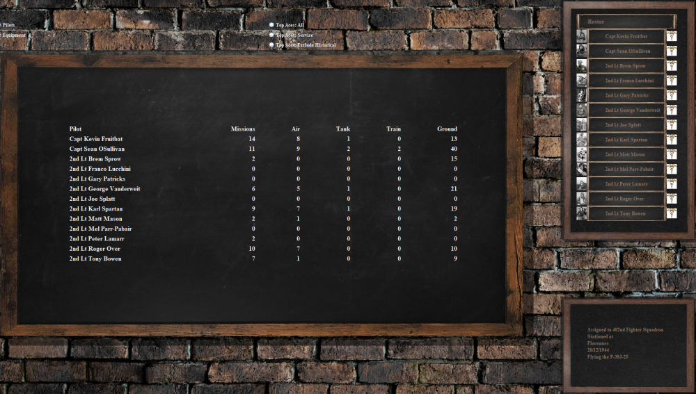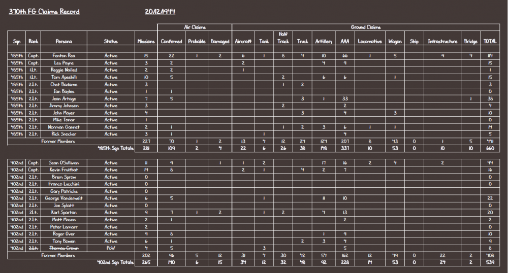 So, as I did back at the beginning of November (campaign date) where I presented the months summary, here are the 2nd Months operations Top-Trump stats for you guys to ruminate on (last months total in brackets): 370th Fighter Group total missions flown to date: 62 (28) 370th Fighter Group total sorties flown to date: 422 (200) 370th Fighter Group total Air Kills to date: 157 (60) 370th Fighter Group total Ground Kills to date: 752 (266) Top Scoring Squadron, Air Kills to date: 402nd - 95 Top Scoring Squadron, Ground Kills to date: 402nd - 391 Top Scoring Pilots, Air Kills: Capt Lt. Fenton Rea, 485th - 26 Maj. Arjen Efftee (KIA), 402nd - 12 Lt. Casey Baker (KIA), 402nd - 11 Top Scoring Pilots, Ground Kills: Capt Lt. Fenton Rea, 485th - 114 Maj. Mick Payne-Less, 485th - 99 Maj. Arjen Efftee (KIA), 402nd - 62 Further Stats: 485th FS: Gr. Kills/Sortie Air Kills/Sortie Losses/Sortie 1.69 (1.32) 0.29 (0.23) 0.103 (0.066) 402nd FS: Gr. Kills/Sortie Air Kills/Sortie Losses/Sortie 1.87 (1.34) 0.45 (0.38) 0.086 (0.074) 410th Bombardment Group total missions flown to date: 14 410th Bombardment Group total sorties flown to date: 33 410th Bombardment Group total Air Kills to date: 5 410th Bombardment Group total Ground Kills to date: 65 Top Scoring Crew, Air Kills: 2.Lt. David Crosby - 4 Maj. E Shoo - 1 Top Scoring Crew, Ground Kills: Maj. Sid Viscous (KIA) - 21 2.Lt. Dave Haggis (KIA) - 21 2.Lt. David Crosby - 13 Gr. Kills/Sortie Air Kills/Sortie Losses/Sortie 1.97 0.15 0.0606 points