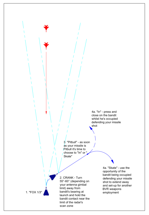 A bit of advice to those new to Beyond Visual Range weapons employment; the Crank is the most fundamental tactic to be employed and if you don't know it or how to use it you are putting yourself at a significant disadvantage when engaging other BVR capable enemies in DCS. The purpose of the Crank is as follows: To limit your downrange travel by reducing your relative velocity towards the enemy thus keeping you further from the enemy (and potentially out of his weapons employment envelope) till the time your missile impacts than if you had kept driving toward the bandit To reduce the weapons employment envelope of the bandit by significantly offsetting the intercept point, causing (i) any missile he employs to pull a significant amount of lead and thus expend energy, and (ii) extending the flight time of that missile and thus depleting it of further energy and reducing it's terminal phase manoeuvrability and therefore lethality.3 points