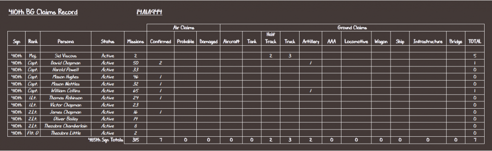 1. DDz Quorum DD_Fenrir Posted November 27, 2020 Author 1. DDz Quorum Posted November 27, 2020 370th FG Awards and Promotions: None. Personnel: We welcome Captain Frank Priory to the 485th as a new Flight Commander; he's an experienced P-38 pilot, having flown a tour in the Aleutians and done a spell of instructing. Rosters: 2 Quote